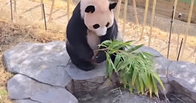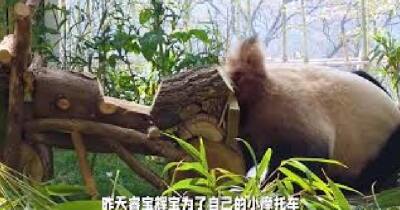 睿寶今天又給自己解鎖了新吃法,給竹子在泳池裡泡一泡再吃 #睿寶 #輝寶